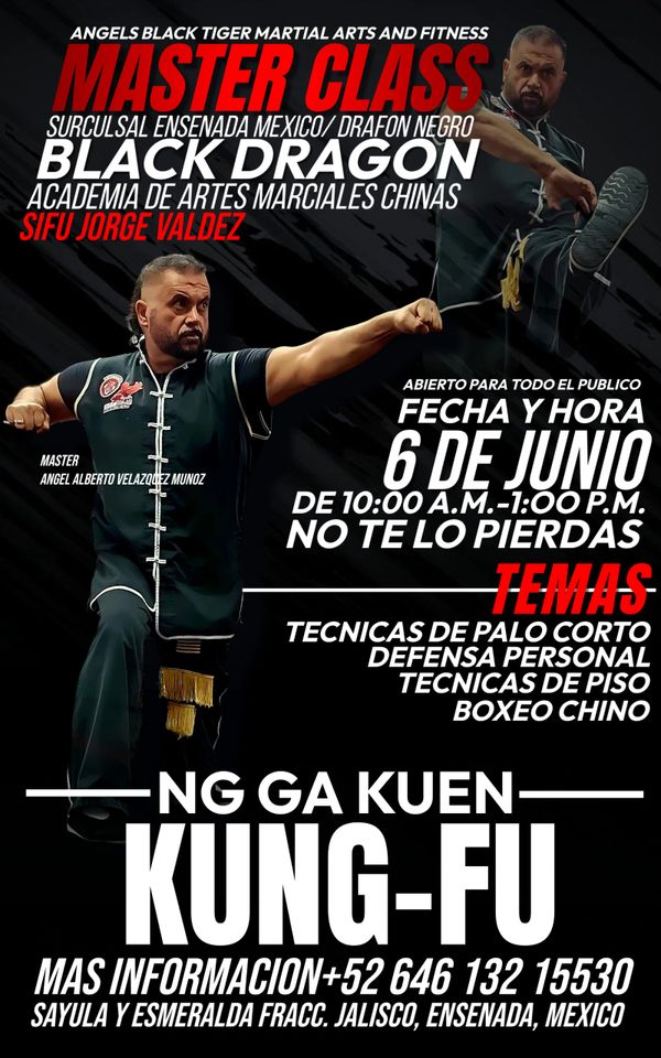Angels Black Tiger Martial Art & Fitness invita al Seminario Black Dragon en Ensenada, Baja California. Bajo la guía de Sifu Jorge Valdez y el Gran Maestro Ángel Alberto Velázquez Muñoz, de 10:00 AM a 1:00 PM, 6 DE JUNIO. Se cubrirán: