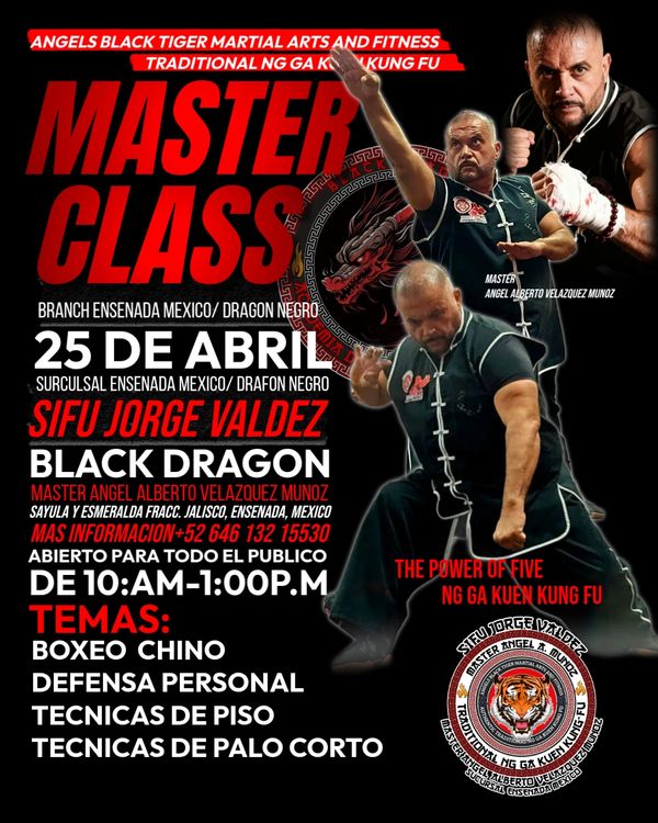 Angels Black Tiger Martial Art & Fitness invita al Seminario Black Dragon en Ensenada, Baja California. Bajo la guía de Sifu Jorge Valdez y el Gran Maestro Ángel Alberto Velázquez Muñoz, de 10:00 AM a 1:00 PM, 25 de abril. Se cubrirán:
